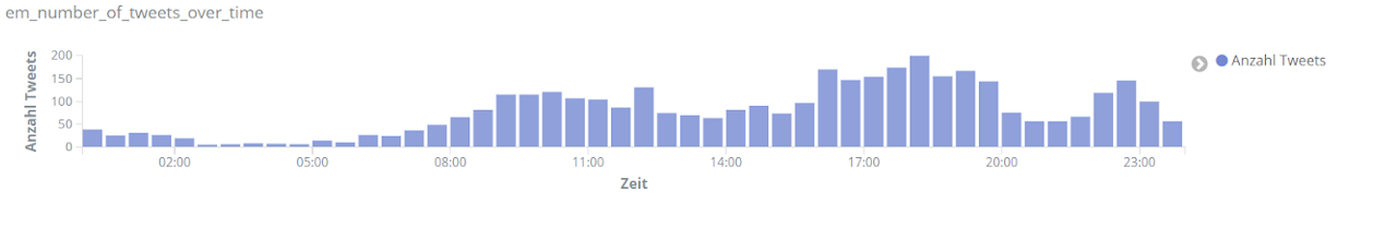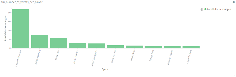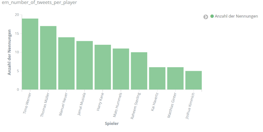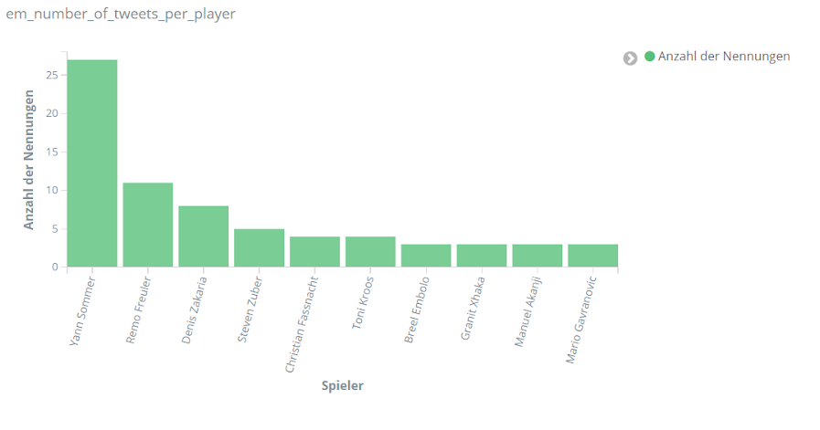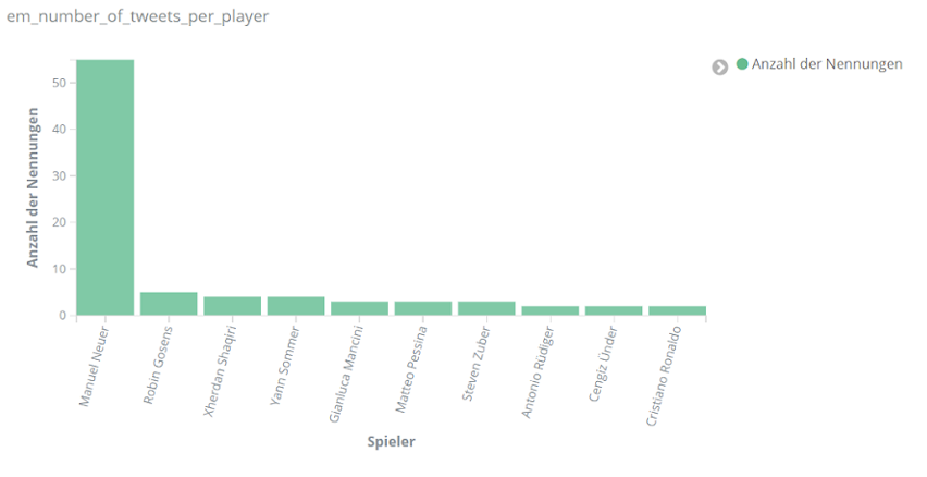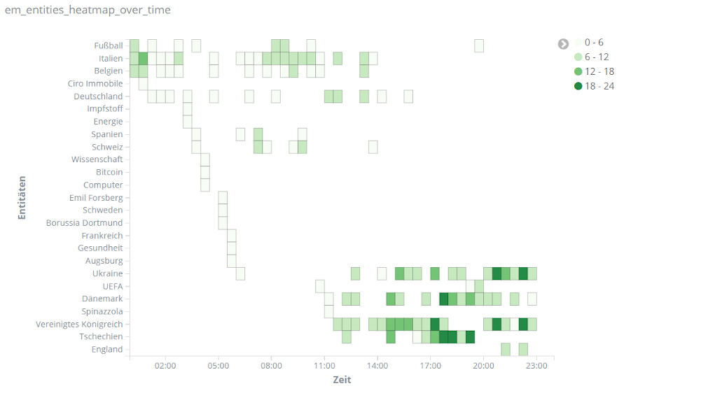 Für echte Aufregung sorgt aber das Spiel Dänemark gegen Finnland am 12. Juni. Dänemarks Spieler Christian Eriksen kollabiert auf dem Spielfeld. Über Stunden dominiert er dementsprechend das Geschehen auf Social Media. Tweets über Eriksen sind um ein vielfaches häufiger als bezüglich anderer Spieler. Unser Text-Mining-Framework findet unter den häufigsten Entitäten für den Zeitraum 18 bis 22.30 Uhr am 12. Juni Begriffe wie “Herz-Lungen-Wiederbelebung”, “Bewusstsein”, “Krankenhaus”, aber auch “Gott” und “Daumen”, die dem Spieler wohl gedrückt wurden.