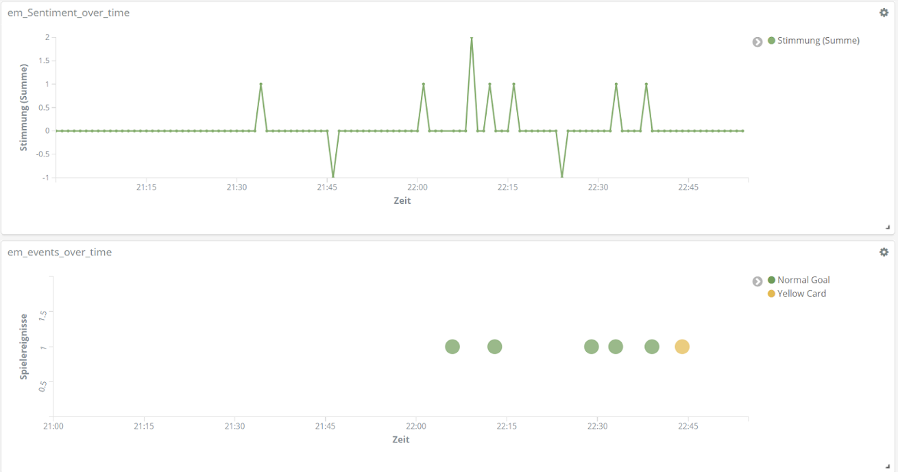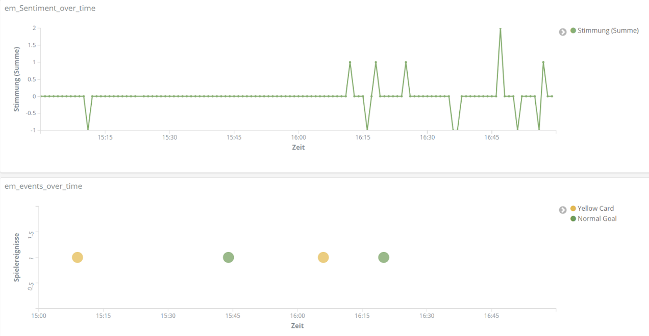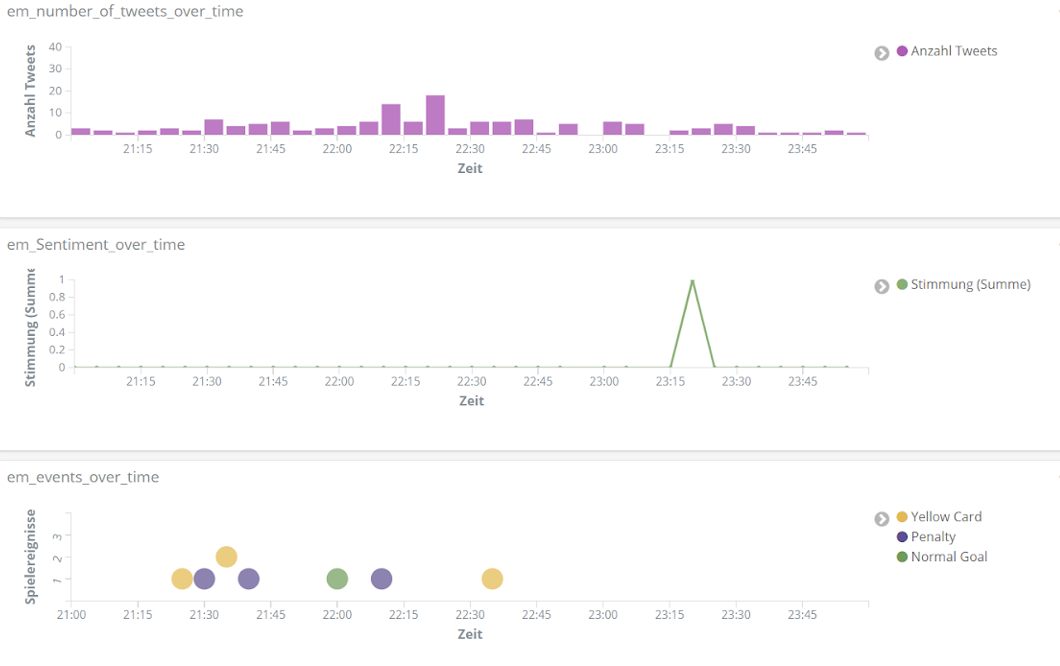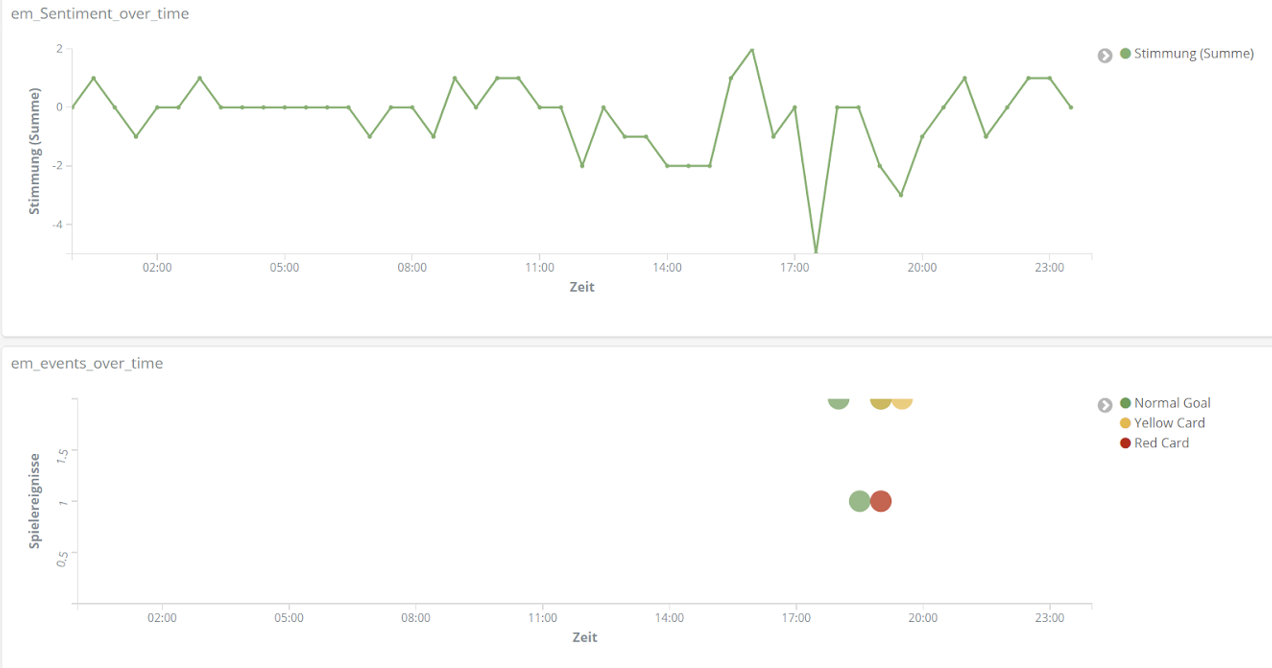 All das analysieren wir mithilfe der Entitäten-Erkennung und der Sentiment-Analyse aus unserem Text Mining Framework TXTWerk sowie dem Open Source Suchsystem Elasticsearch und der dazugehörigen Visualisierungsplattform Kibana. Damit vereinen wir unsere beiden Kernkompetenzen, Suche und Text Mining, zu einem geeigneten Analyse-Tool auch für das Thema Fußball.