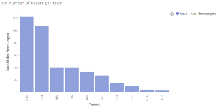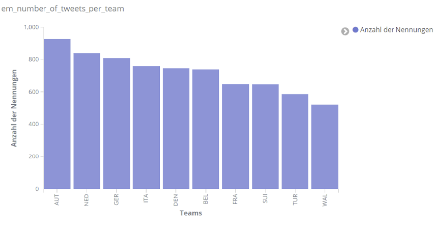 Unabhängig von einzelnen Spielern wurde aber auch den einzelnen Mannschaften der EM verschieden viel Interesse entgegengebracht. Wie zu erwarten bei unserer Analyse, die deutschsprachige Reaktionen in den Vordergrund stellt, erscheint das deutsche Team besonders häufig in den Kommentaren auf Social Media. Mit England und Italien folgen anschließend die beiden Finalisten.