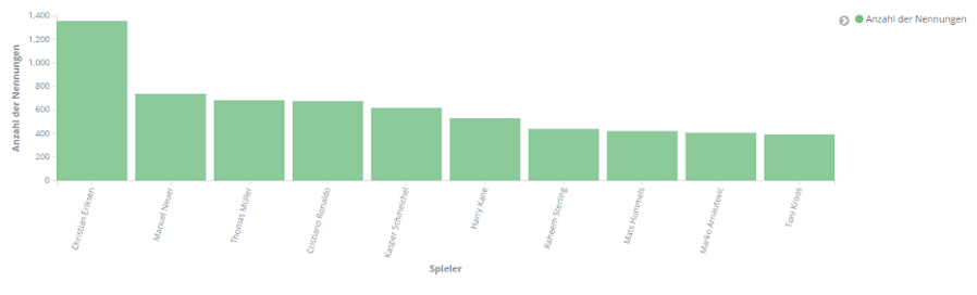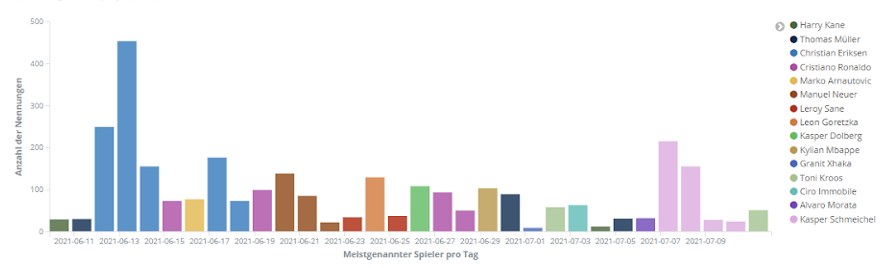 Trotz aufgeregter Diskussionen um Manuel Neuers Kapitänsbinde oder über den Ausstieg von Toni Kroos ist es Christian Eriksen, der aufgrund seines plötzlichen Zusammenbruchs in einem der ersten Spiele der EM insgesamt die Liste der meistgenannten Spieler anführt.