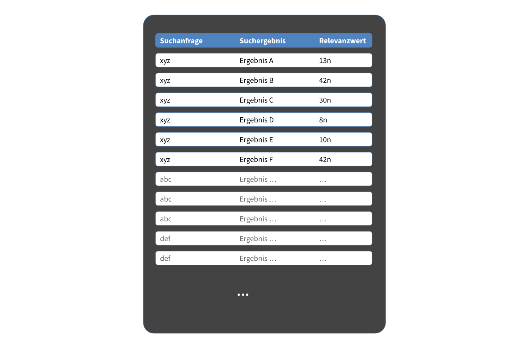 In unserem Beispiel konnte so das Ranking anhand des Klickverhaltens der Nutzer für eine interne Suche eines Versicherers angepasst werden. Durch die Auswertung der angeklickten Treffer auf der Suchergebnisseite ließ sich die Qualität des Rankings einfach bewerten und sukzessiv optimieren.