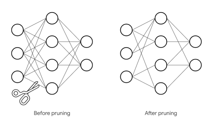 Beim Pruning wird versucht, redundante Verbindungen in der Architektur zu entfernen. Dabei werden irrelevante Gewichte, die in der Regel als Gewichte mit kleinem Absolutwert definiert sind, herausgeschnitten. Nach dem Pruning erfolgt ein fine-tuning des Modells, um die Genauigkeit wiederherzustellen. Hierbei können voll verknüpfte Schichten und Convolutional Neural Networks (CNN) in der Regel bis zu 90 % reduziert werden, ohne an Genauigkeit zu verlieren.