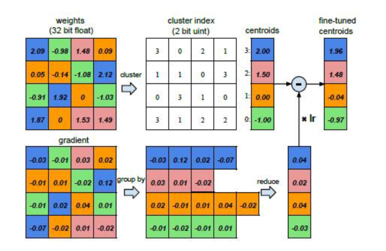 In dem unten aufgeführten Beispiel waren zunächst 32 Bits*16 = 512 Bits erforderlich, um sie darzustellen. Nach der Quantisierung werden nur noch 32 Bits *4 + 2 Bits*16 = 160 Bits benötigt, um sie darzustellen. Beim fine-tuning wird der Gradient für alle Gewichte, die zur gleichen Farbe gehören, summiert und dann vom Schwerpunkt abgezogen. Dadurch wird sichergestellt, dass die bei der Quantisierung vorgenommene Clusterbildung beim fine-tuning beibehalten wird.