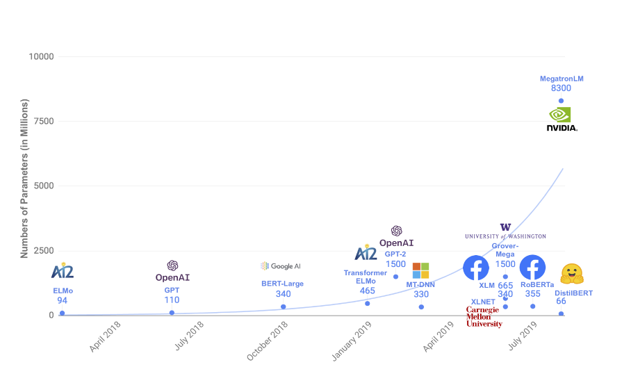 Neben BERT, RoBERTa und XLNet wurden in den letzten Jahren viele andere erfolgreiche Modelle entwickelt, mit wachsender Anzahl von Parametern. Das folgende Diagramm gibts uns einen guten Überblick darüber.